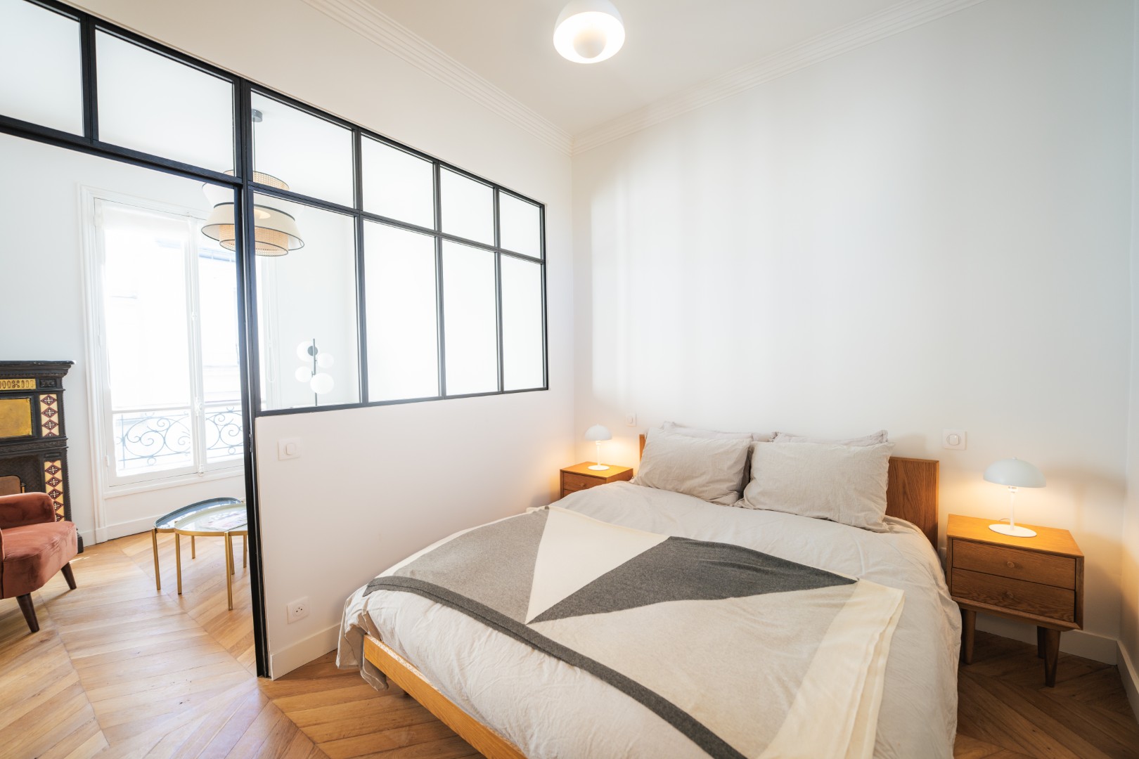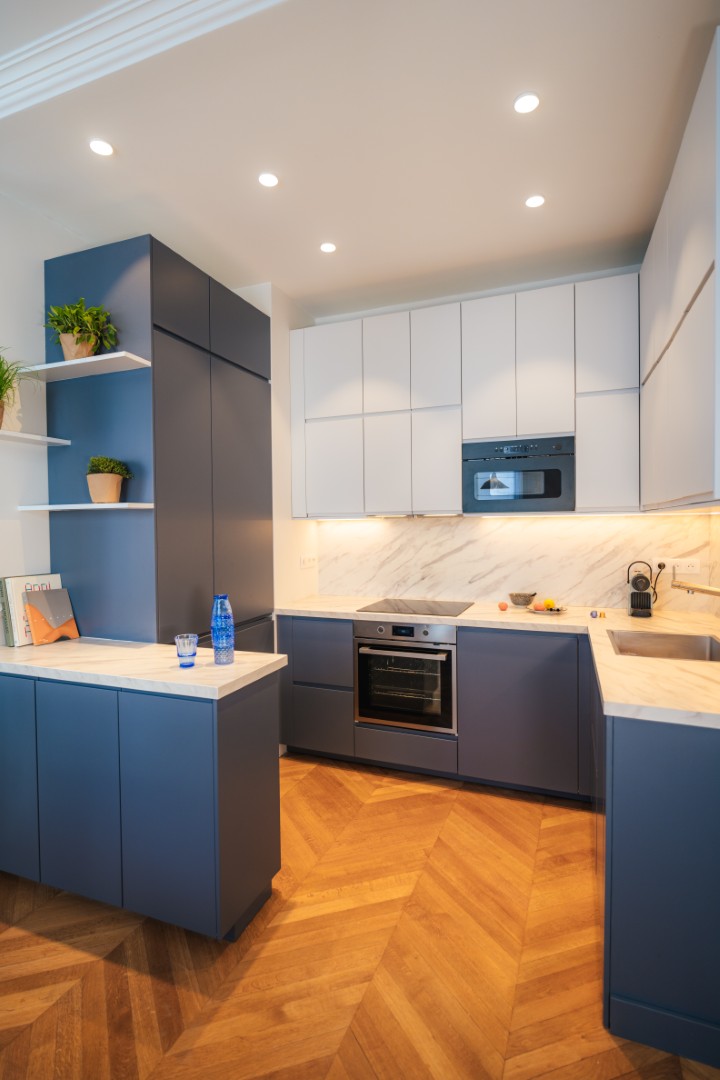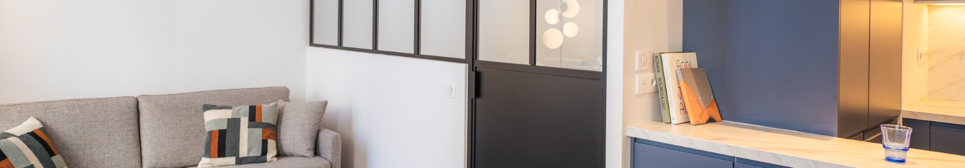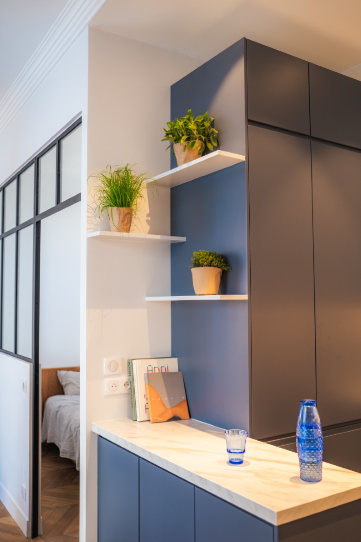 Nous avons entièrement restructuré le plan de l’appartement, redistribué les espaces, déplacé la cuisine et la salle de bains, ouvert la cuisine sur le salon, séparé la chambre de la pièce de vie par une grande verrière atelier, et conçu de la menuiserie sur-mesure dans toutes les pièces, y compris les circulations.