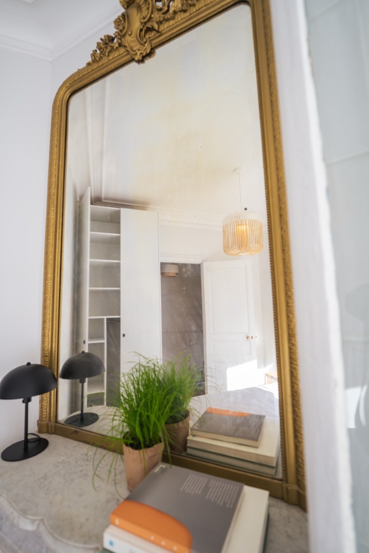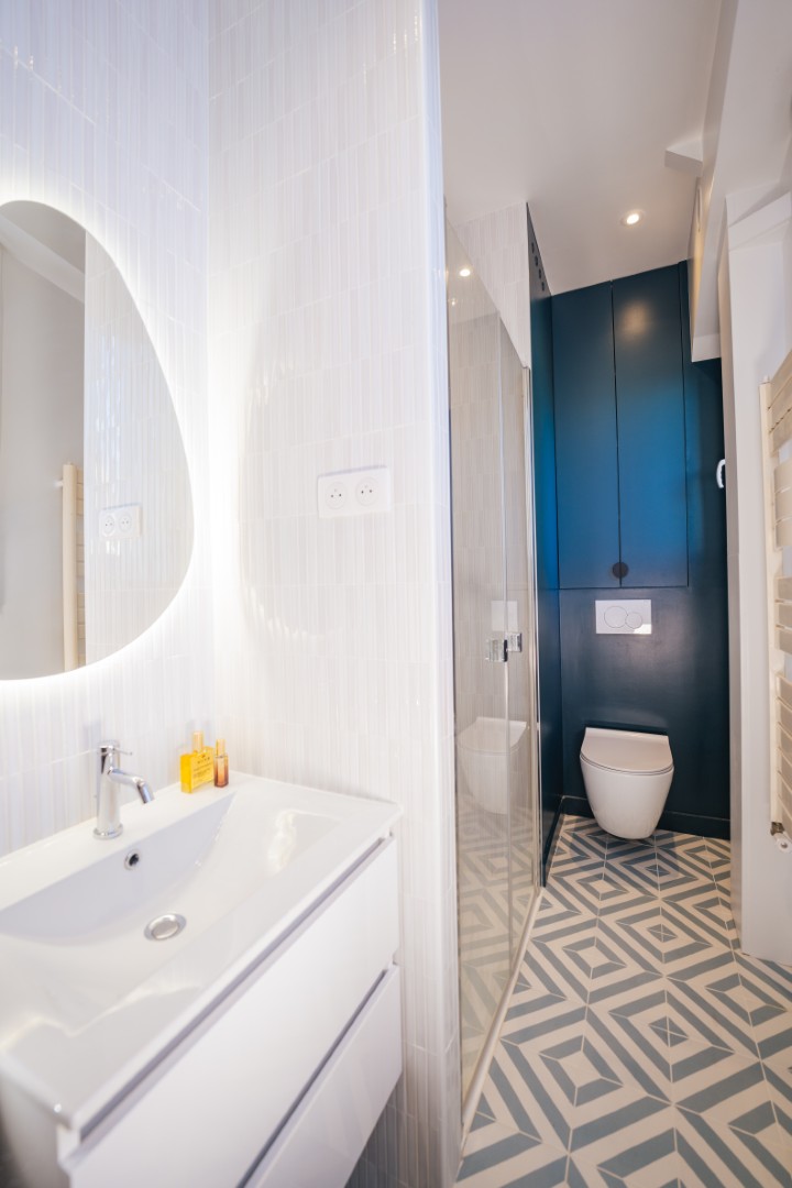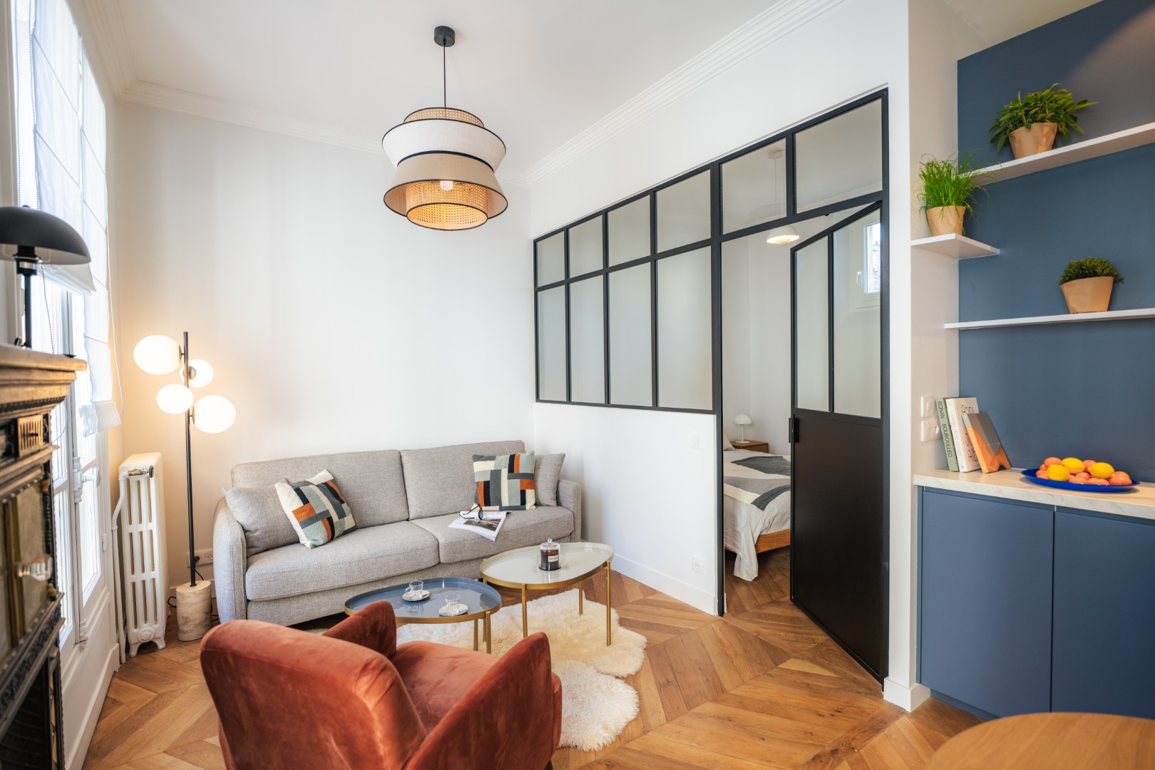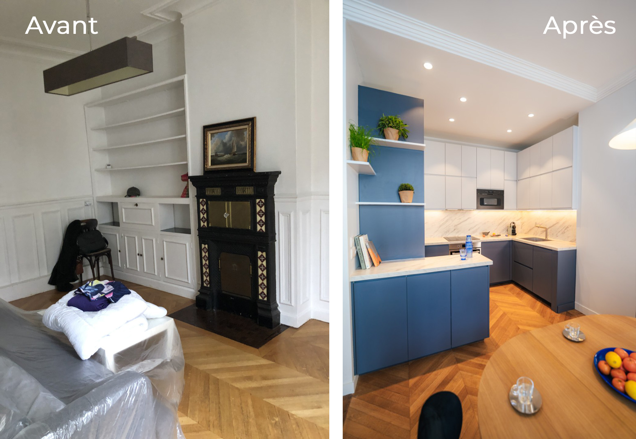 Nous avons entièrement restructuré le plan de l’appartement, redistribué les espaces, déplacé la cuisine et la salle de bains, ouvert la cuisine sur le salon, séparé la chambre de la pièce de vie par une grande verrière atelier, et conçu de la menuiserie sur-mesure dans toutes les pièces, y compris les circulations.