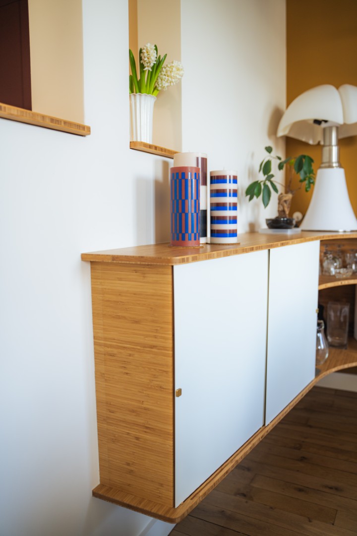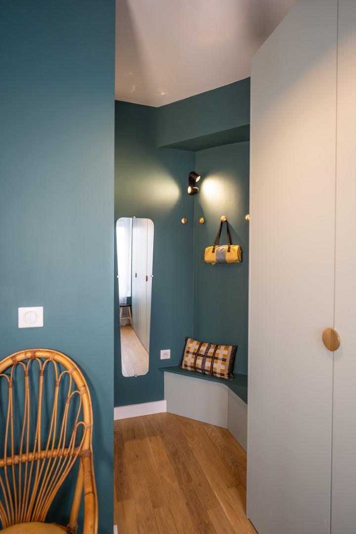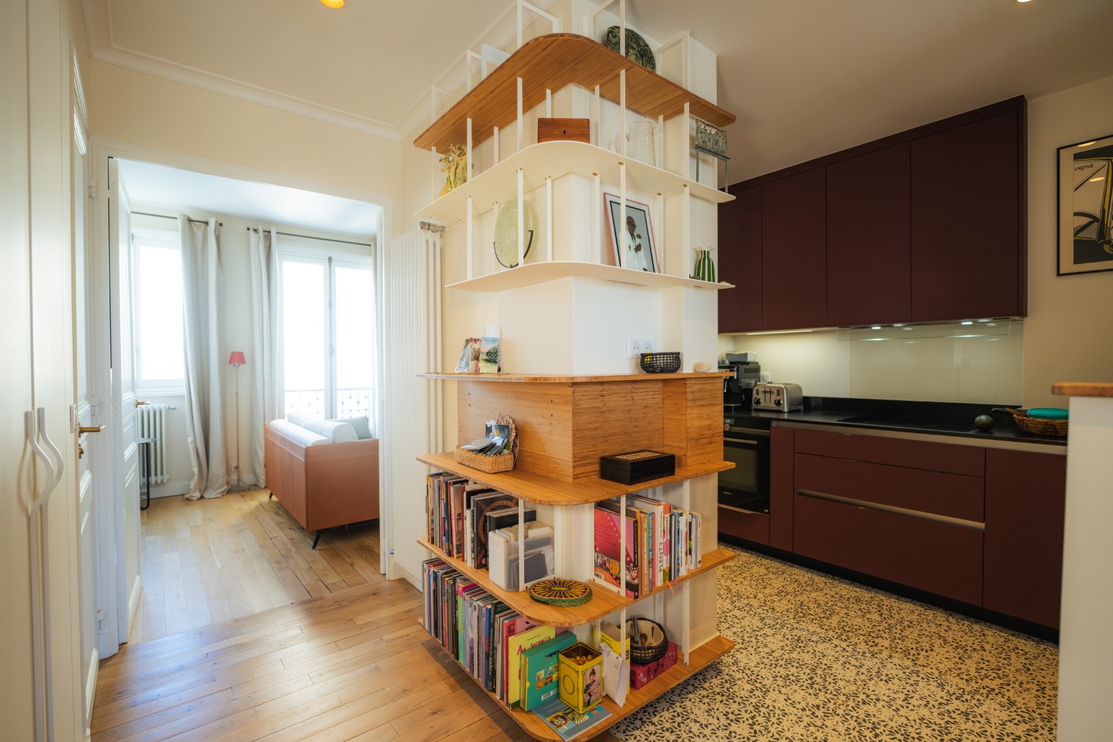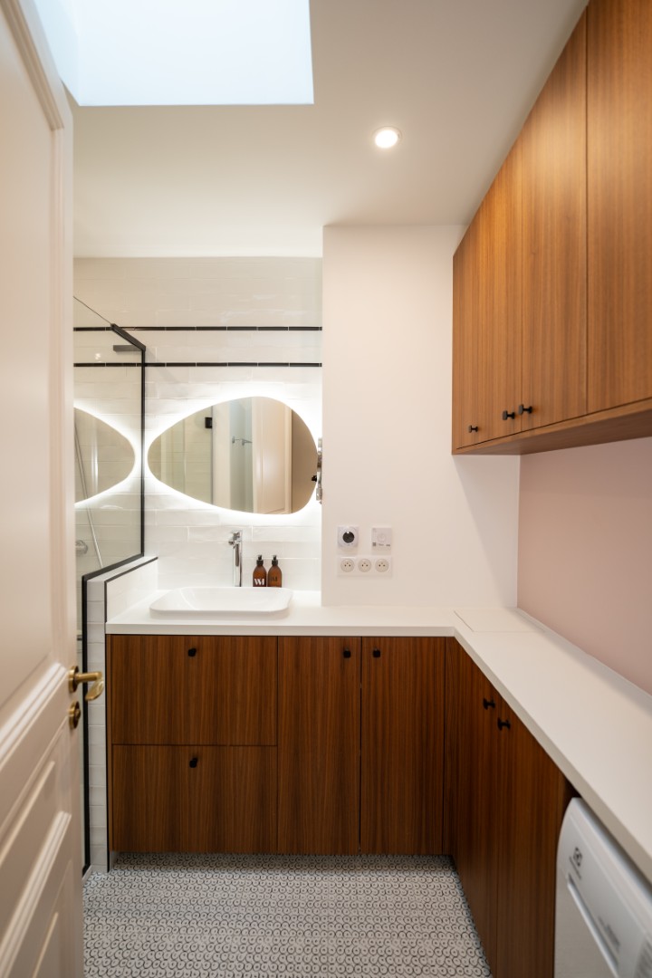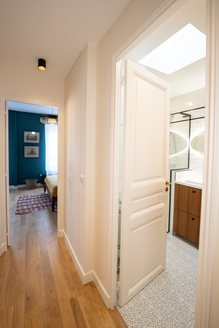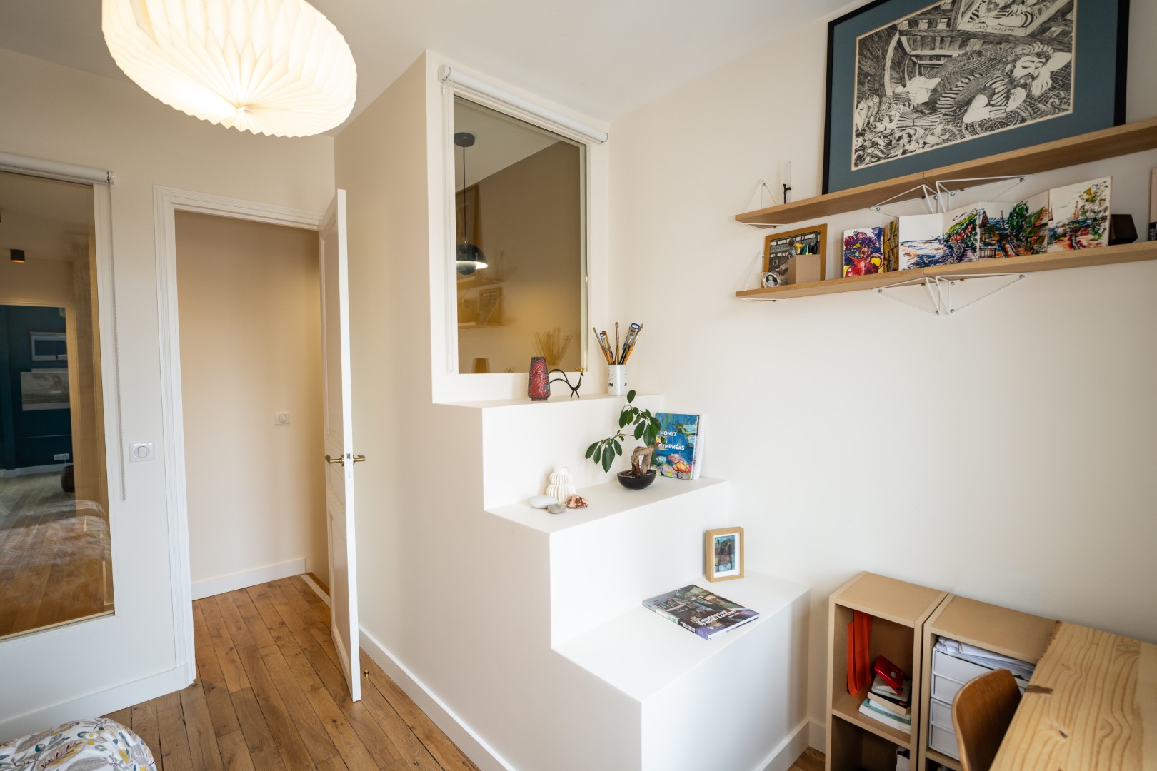 L’inversion du sens de l’escalier d’origine a été l’intervention structurante du projet. Cette manœuvre a permis une restructuration complète du plan, en maximisant la surface utile et les rangements, en optimisant la fluidité spatiale et en augmentant l’apport en lumière naturelle. Les circulations superflues ont été éliminées.