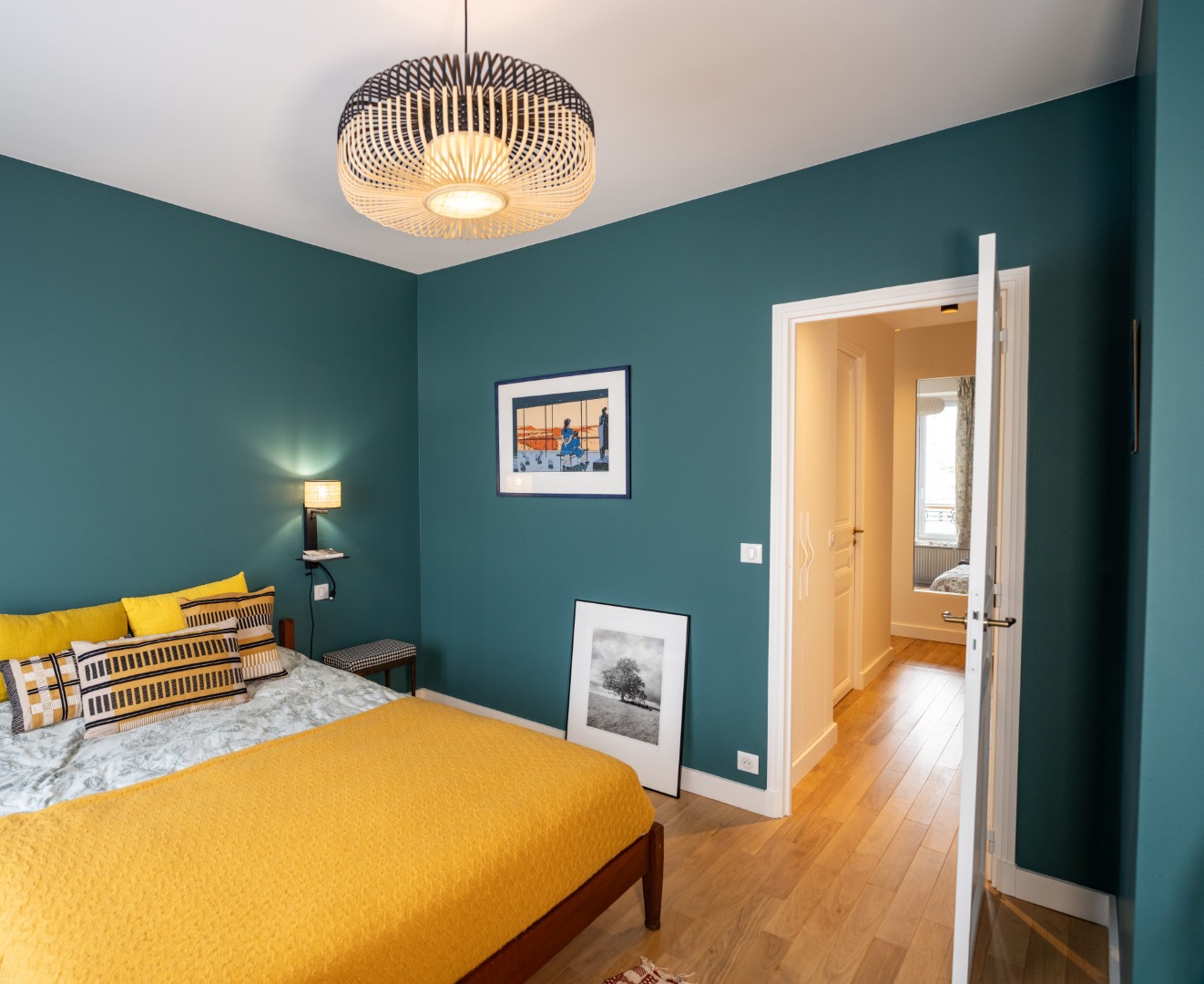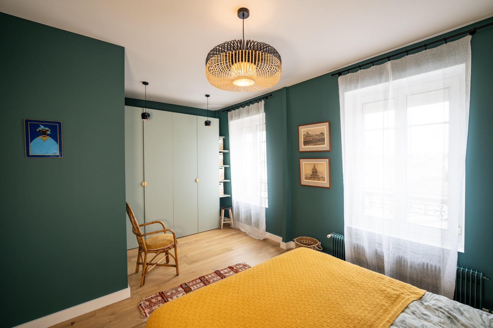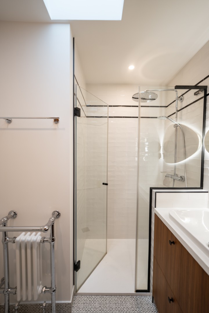 À l’étage, le réaménagement de la circulation a permis de créer une pièce supplémentaire (un bureau fonctionnel remplaçant un palier sombre et mal exploité) ainsi qu’une suite parentale spacieuse et généreusement éclairée.