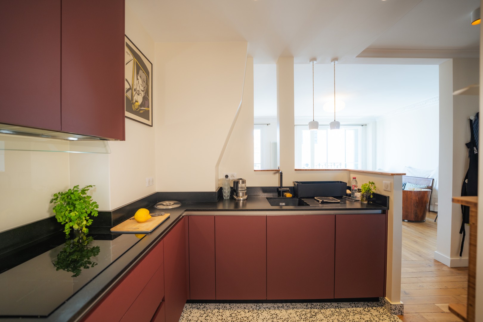 Au niveau bas, la cuisine a été déplacée. Elle occupe désormais une position centrale et stratégique. Ouverte sur l’espace de vie, elle devient un véritable cœur convivial favorisant l’interaction.